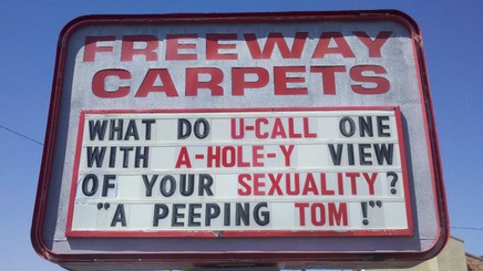 First of all, Pastor Tom Brown should stop being such a drama queen. In my opinion, he personifies hypocrisy. He has absolutely no problem with a sign that shows Mayor Cook dripping with blood, but he has a fit on camera over the guy at Freeway Carpets that had a sign that was only text.