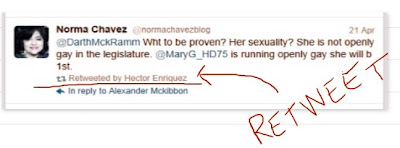 For example...former State Representative Norma Chavez, famous for outing current State Representative Naomi Gonzalez's sexuality in a forum, posted this Tweet in which, yet again, she mentions a candidate's sexuality.