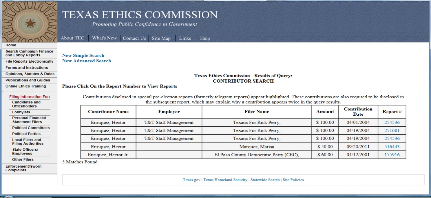 As you can see in this screen shot taken from the Texas Ethics Commission website, it looks like Enriquez has provided financial support to the one Republican who might actually be more unpopular than Bush, Texas Governor Rick Perry.