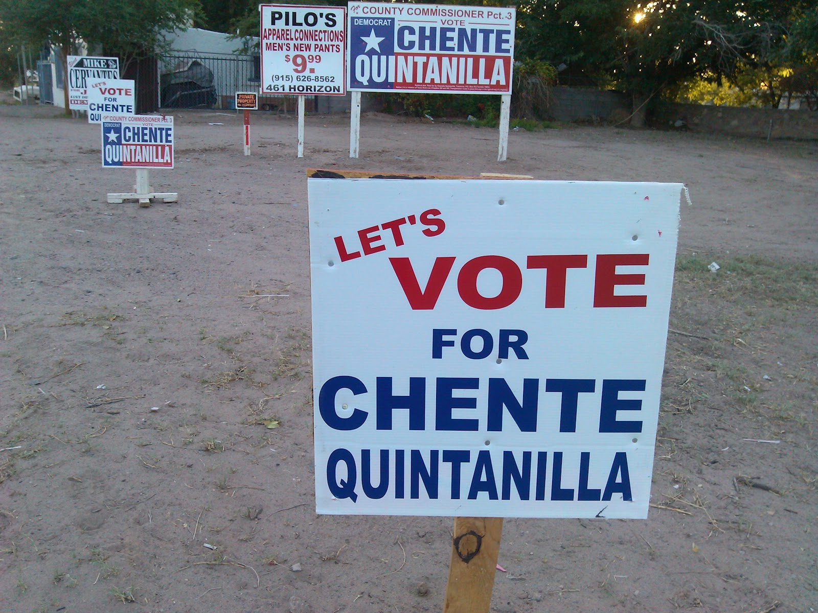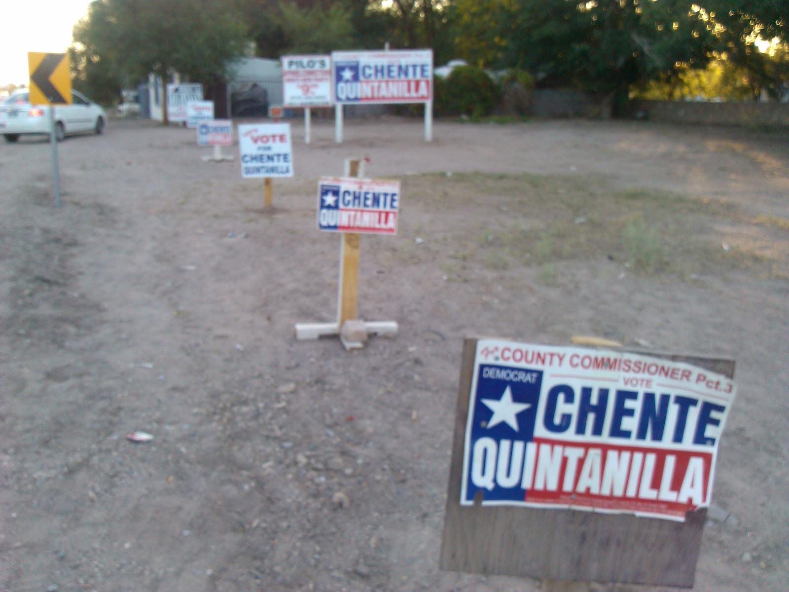So I've been poking around in Socorro lately and I noticed some signs on Horizon Blvd just south of North Loop. As you can see in this picture, the area the signs are on belongs to a supporter of Chente Quintanilla who is running for County Commissioner in Precinct 3 against Vince Perez.