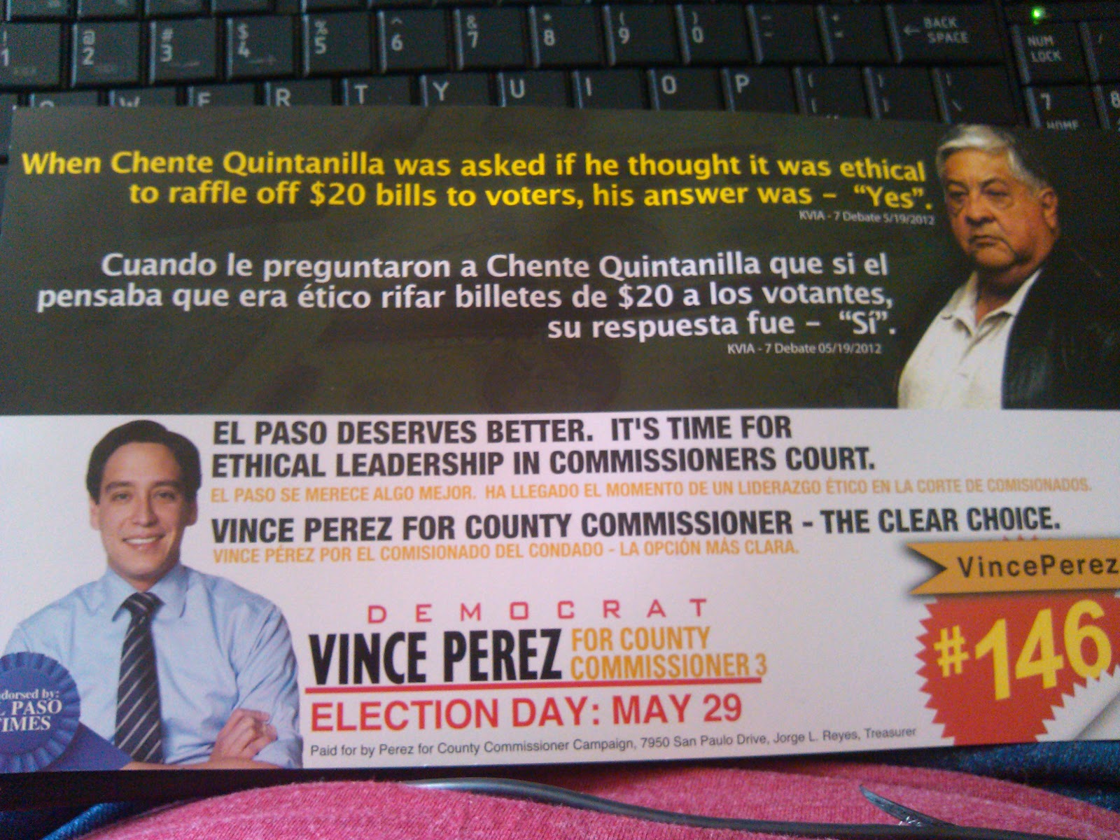 At any rate, Quintanilla should be careful about ethical questions. As you can see, Perez has already sent out a mailer to voters about the fact that when asked if Quintanilla felt it was ethical to raffle away $20 bills to potential voters he replied "Yes".