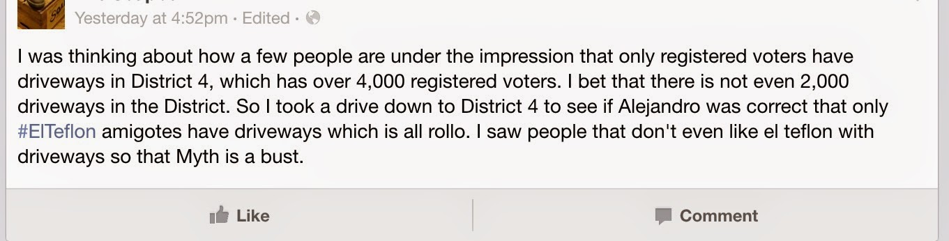 What the author is alluding to is an accusation that was leveled against Jesse Gandara's counsel that only registered voters were getting driveways. The author of the page is correct, there are far more registered voters in District 4 than there are driveways. That is 100% accurate.