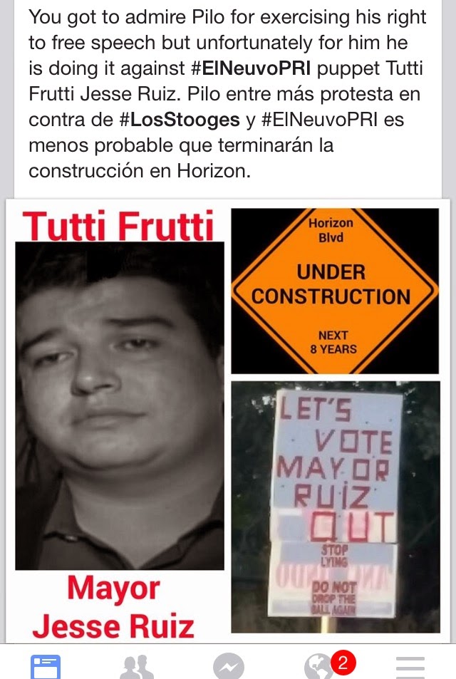 Yes he calls him Tutti Fruitti. Either the author is saying Mayor Ruiz is a big fan of Little Richard or he's making a remark about Mayor Ruiz sexuality. You'll note in the text several references to things like El Nuevo Pri and Los Stooges. I told you the Gandaras were big on nicknames...(also I don't recall the last time Pilo backed a winner in Socorro, although its interesting to note that the use of another political sign for a different political message is actually prohibited. Way to go Pilo.)