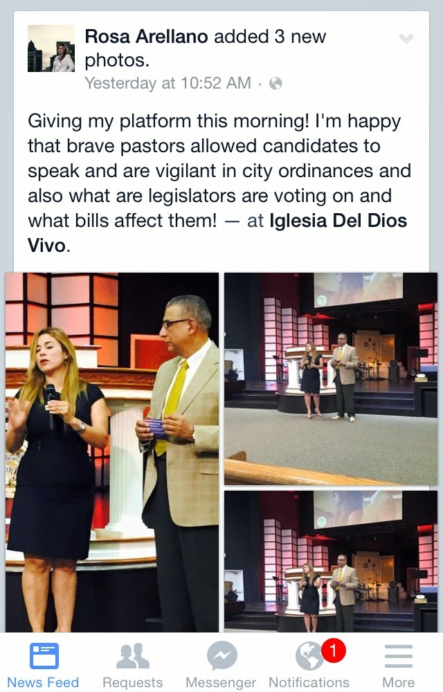 Religion in campaigning doesn't stop with Manny Hinojosa in district 1. In district 5, challenger Rosa Cabrera (Arellano) has made religion a part of politics for quite some time. Much more overtly in fact.