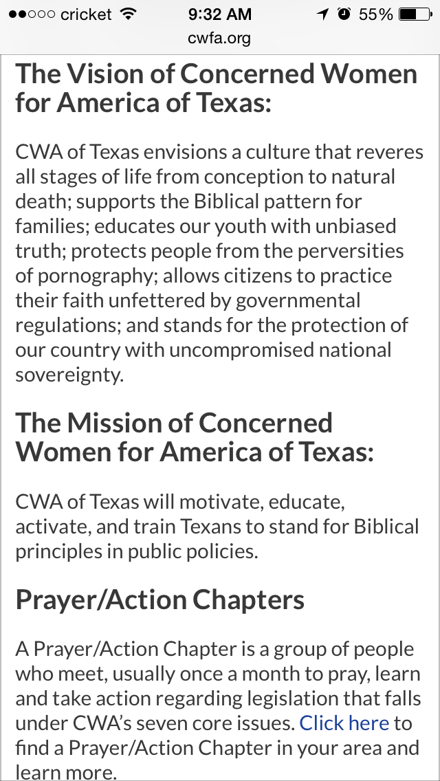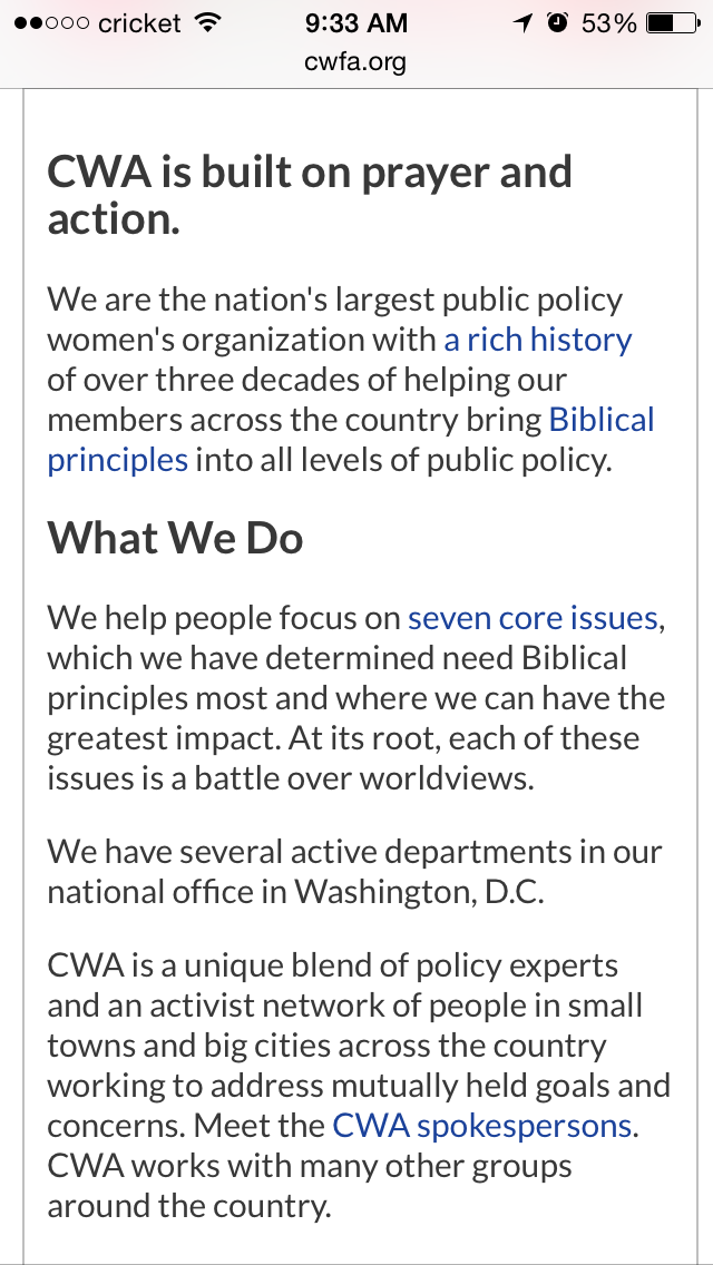 I dug through the website in order to get a better sense of what the organization does and what their goals are. They basically make no bones about it, the organization's goals are to "bring Biblical principles into all levels of public policy."