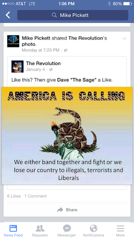 One's political views can change over time. But this post was from earlier this year. Mr. Pickett shared this image that equates illegals, terrorists, and liberals. That might be some of the most inflammatory stuff I've seen in recent memory. The undocumented aren't terrorists. Neither are liberals.