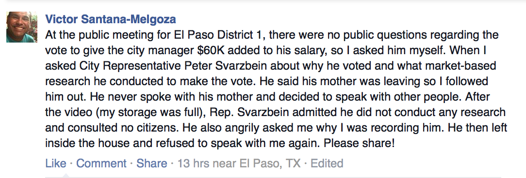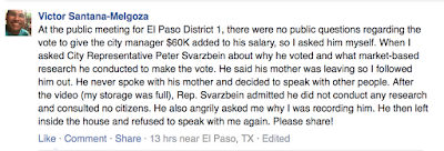 But the day got worse for him. Apparently last night there was some sort of community meeting and a community member approached Svarzbein with a question about why he voted for the City Manager's raise and what he based it on.