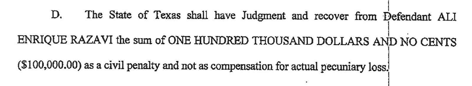 Ali Enrique Razavi Ordered to Pay $100k in Deceptive Trade Practices Suit