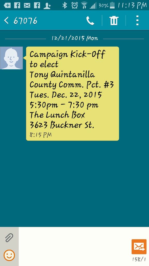 In December the Tea-janos sent out a text notification for the "Campaign Kick-off to elect Tony Quintanilla County Comm. Pct. #3" The message was sent out December 21st at 8:15pm. There is no indication who approved the message to go out.