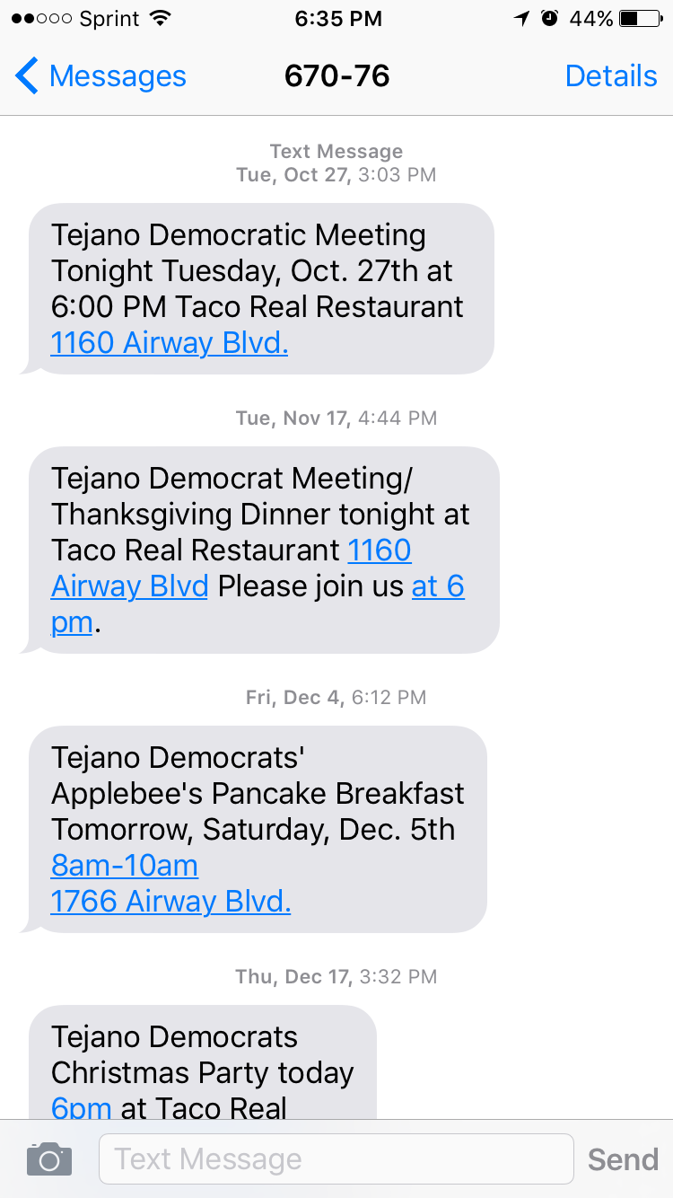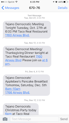 Once Eddie Holguin, spouse of Iliana Holguin the current Secretary of the El Paso Democratic Party who is running unopposed for the the Chair in the March Primary, took over the Tea-janos he implemented a new notification system to membership of meetings. So in addition to sending out a monthly reminder letter to members, and an email notice, they also send out a notice via text message.