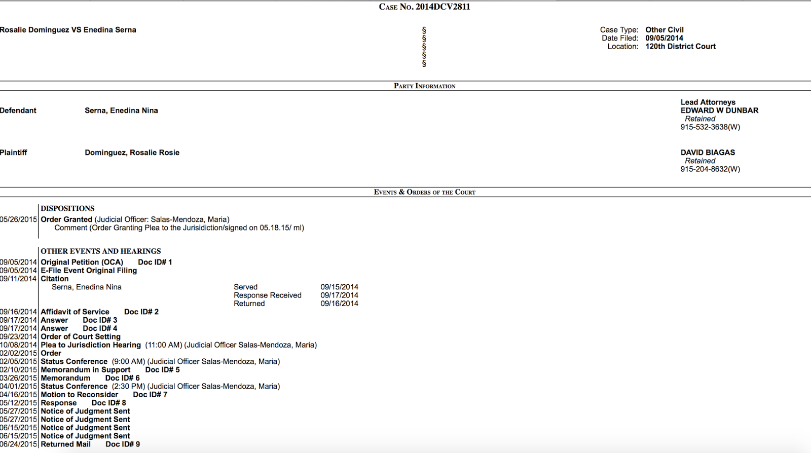 There was another lawsuit alleging defamation that was filed against all the aforementioned individuals and a couple of other people from Judge Dominguez, and that case was filed in 2014 at the same time as the alleged voter fraud case.