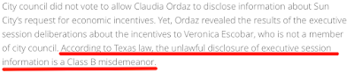As it is pointed out in a story by the El Paso Times, disclosure of executive session information in and of itself is not a crime.