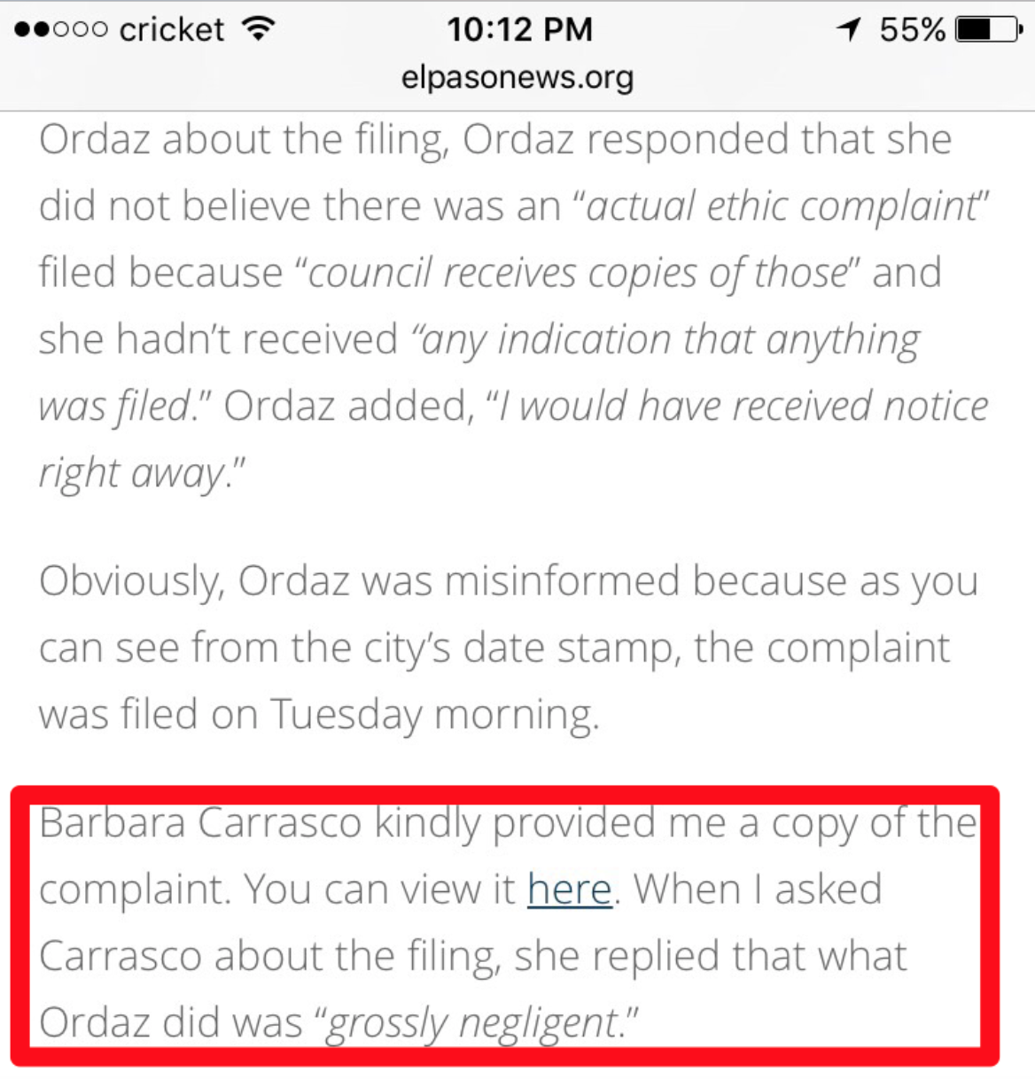 But he had to admit it, he had already been exposed. Yesterday I wrote about how he had been very obviously supplied with details of the complaint long before anyone else and long before Rep Ordaz had even been given a copy of the complaint by city officials.