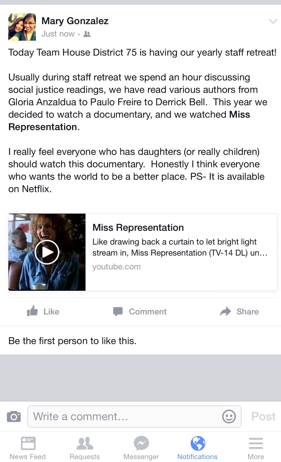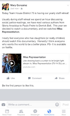 Coincidentally the day before was the start of her annual staff retreat. Its typically held of a few days and Rep Gonzalez uses the time for staff development. Here's a couple of screen shots that show her staff in town for the retreat and another screen shot has Gonzalez's mention of her retreat with staff.