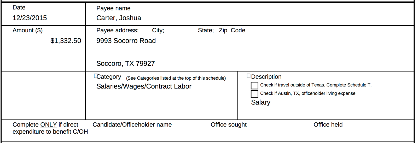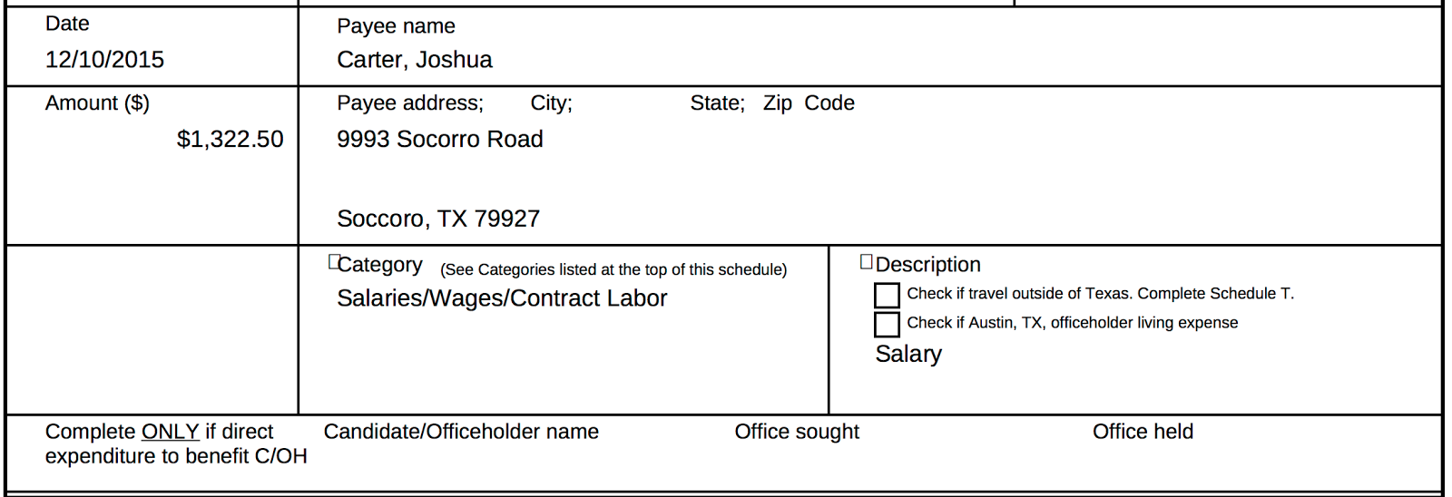 Her current staffer for the local office Joshua Carter received two payments that were about two weeks apart from one another, presumably for compensation for campaign work.