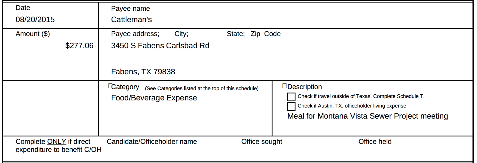 As you can see in this part of Gonzalez's campaign finance report she indicates that she took some people to the expensive restaurant to discuss, of all things, the Montana Vista Wastewater Project.