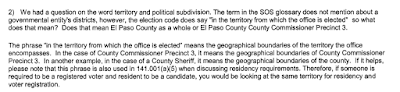 So before responding to Commissioner Perez, the Party was already told by the authoritative voice on the issue that Quintanilla had to live within the confines of Precinct 3. Are there any of you reading this that interprets the answer from the Secretary of State differently?