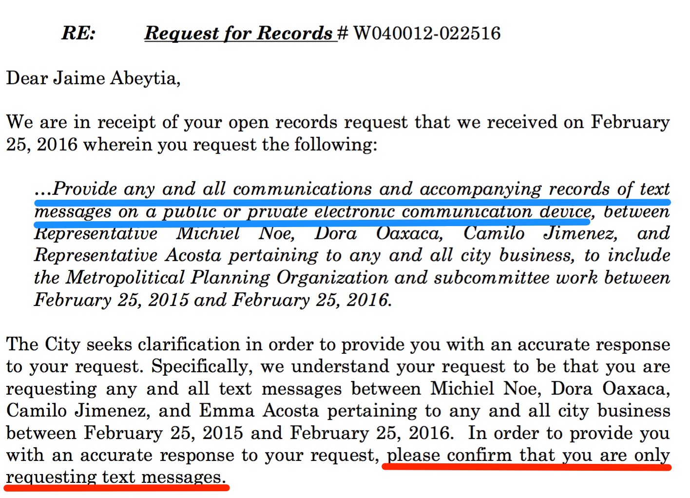 So back then when it was against a member of council they didn't like, they wanted to be open and release shit even if it didn't have anything to do with request. But when I make an open records requests for THE SAME INFORMATION from another city representative, text messages having to do with city business, her office sends me a letter asking me to clarify if I meant text messages in the part of my request that reads the words, "text messages".