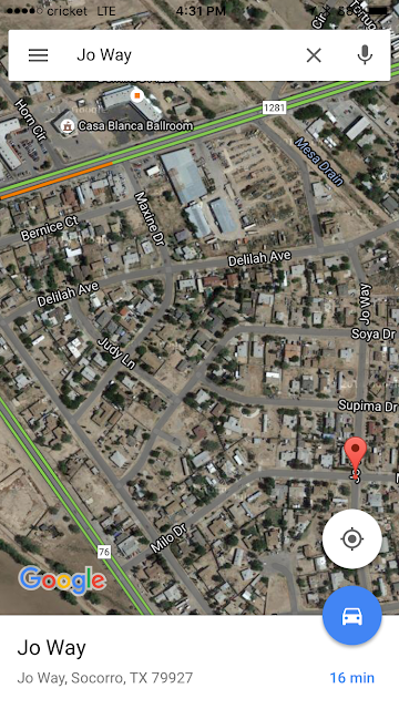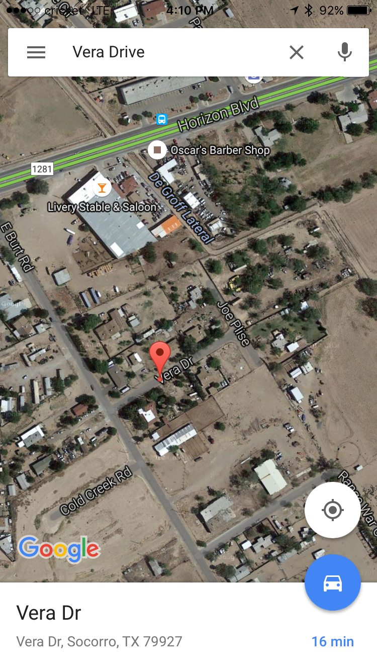 For context, the Livery Stable & Saloon that you see on the map fronts Horizon Boulevard. Its frequently used for political events in the valley by State Rep Mary Gonzalez and very famously by Dora Oaxaca and Willie Gandara. Oscar's barbershop is next door and that is where Chente Quintanilla, who was one of Oaxaca's opponents for county commissioner back in the day just happened to be getting his hair cut on the day of her announcement. He lives in Tornillo, about 20 miles away.