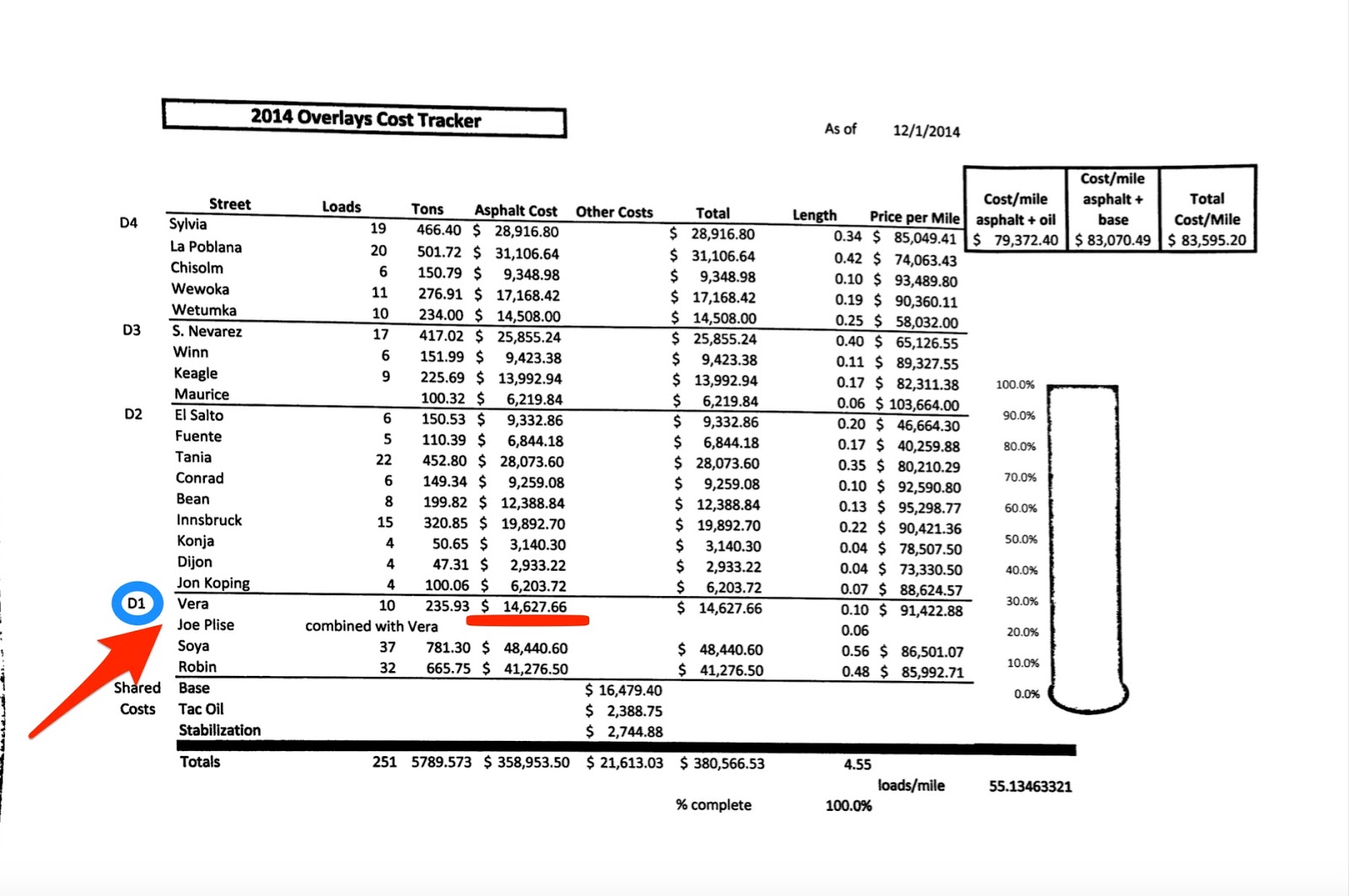 I draw your attention to the area circled in blue which indicates the district requesting the overlays on the streets that are pointed to with the red arrow. The cost for the two streets is underlined in red, for a total of $14,627.66.