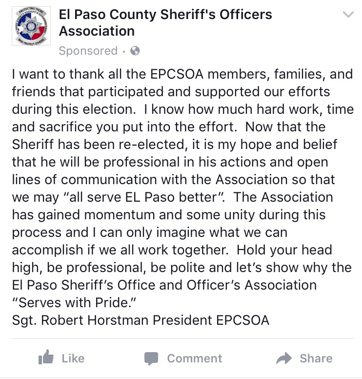 Now that really wouldn't matter if it weren't for the fact that President Horstman sent out this sponsored Facebook post after the election that calls on the sheriff to be professional before he calls on his own guys to be professional. He apparently hasn't seen his boy Marco Camarillo all over Facebook during this election.