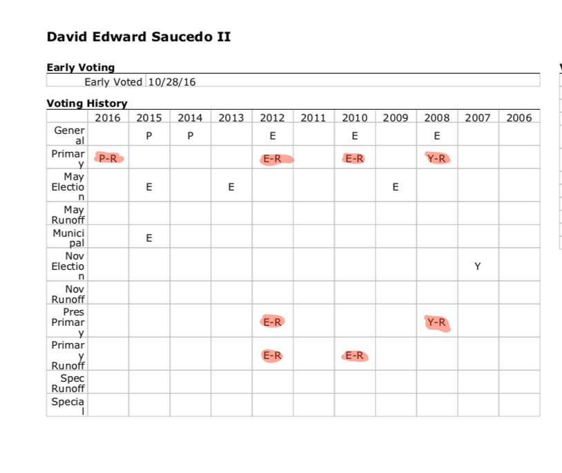 Here is a screen shot of his voting record. I highlighted the times he voted Republican in red. As you can see, in ever election since he was old enough to vote, Saucedo has voted Republican. The races that have no highlight are general elections or non-partisan elections.