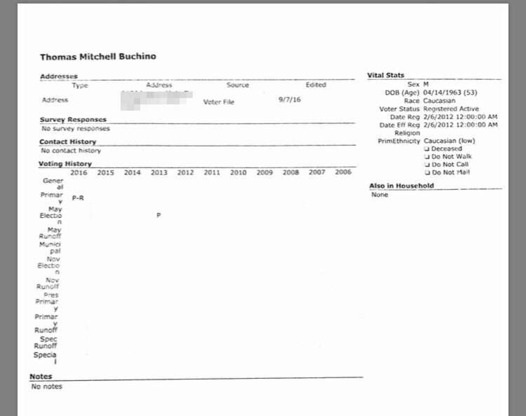 Well here's the latest development. Its one thing for Buchino to claim to not be a politician, but Buchino is asking voters to do something in Texas he apparently hasn't done...vote in a general election. Prior to voting for himself earlier this year in an uncontested race, as you can see in this record, the ONLY other time Buchino has actually taken the time to do his civic duty was in the 2013 municipal election.