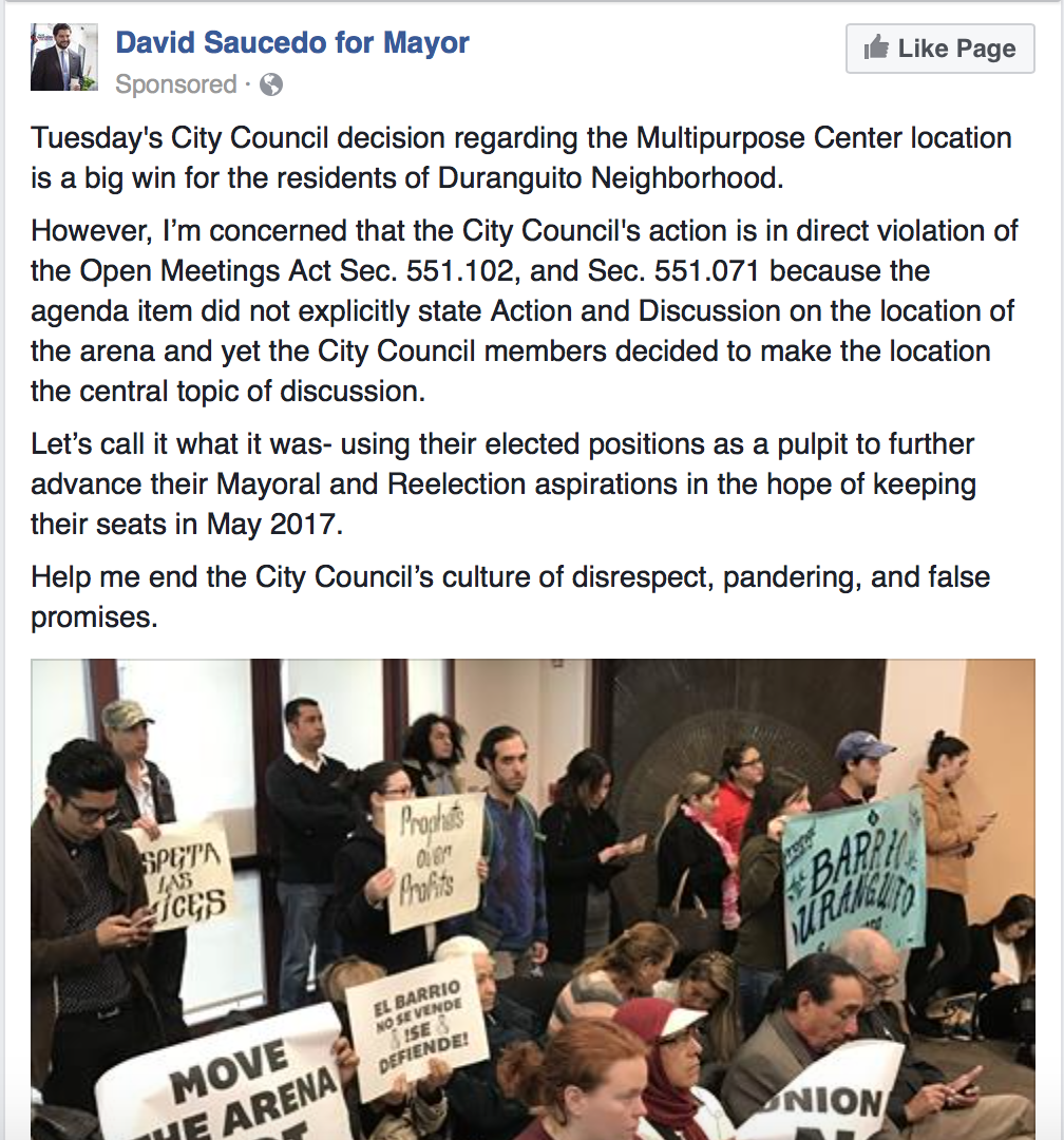 An email was circulating by Duranguito people actually thanking David Saucedo for his support for their cause. Saucedo sent out a statement to media and also put out a sponsored post that contained the same information. Thats where I saw it.