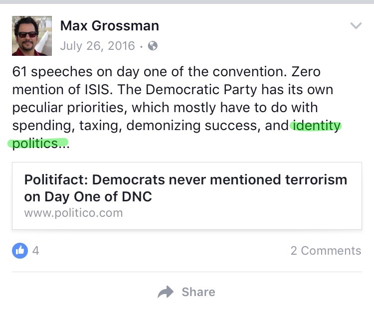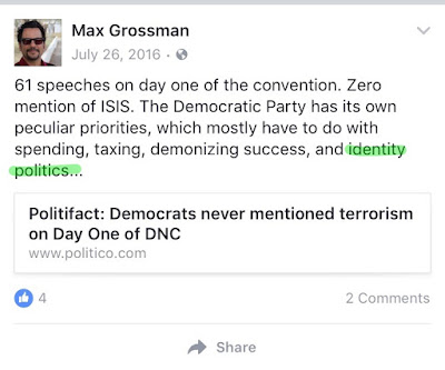 Here's something really interesting coming from Grossman about how we Liberals are always involved in "identity politics". That is Republican code for the fact that they are uncomfortable with minorities talking about minority issues.