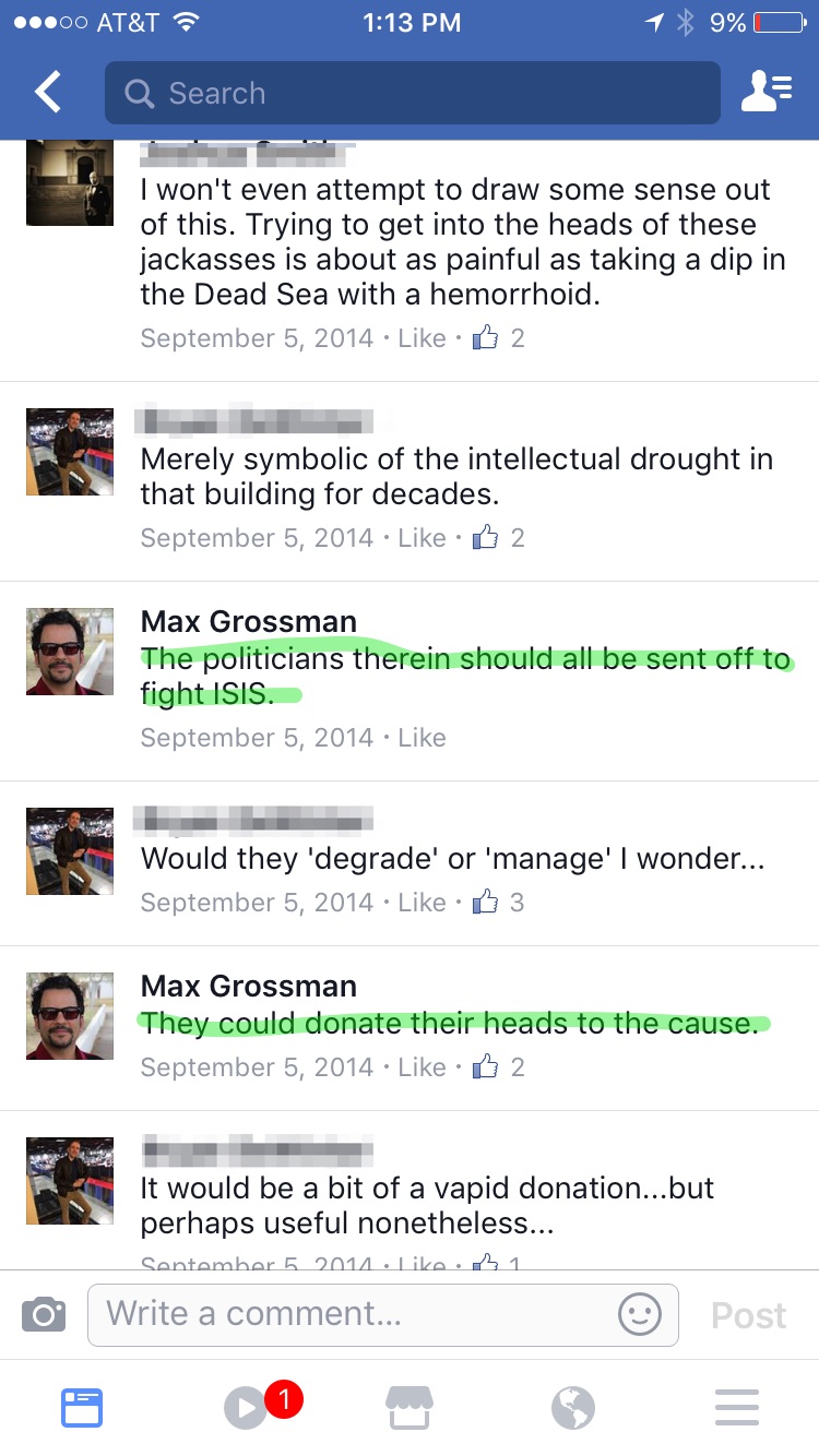 Okay, so Grossman and I disagree on politics. He's a conservative, I'm a Liberal. Its not a matter of life or death. But hey, speaking of death...take a look at what he has to say about elected officials he doesn't agree with: