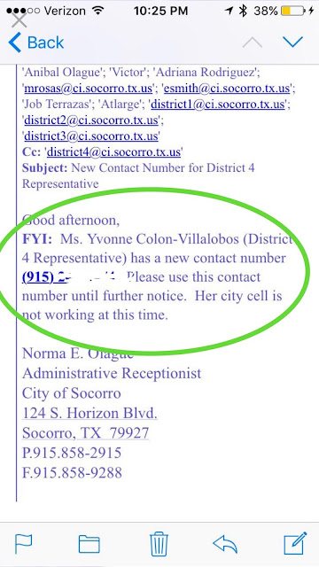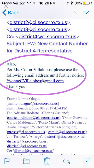 According to emails obtained by The Lion Star Blog, Socorro City Rep Yvonne Colon-Villalobos, who together with City Rep Maria Reyes engineered the railroading of former Mayor Gloria Rodriguez, inexplicably decided to move away from using the city-issued email addressed assigned to her, in favor of using per personal email address for business purposes.