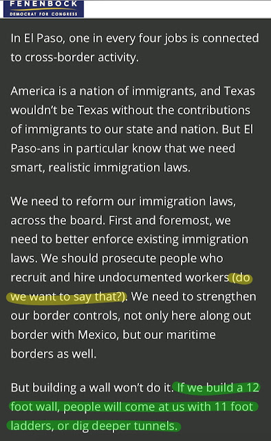 But for us humble little Latino folk here in the 16th Congressional District of Texas, our favorite part has to be the section in green! Does she think Latinos are so dumb that they wouldn't figure out that you need a ladder that is higher than the wall to scale it?