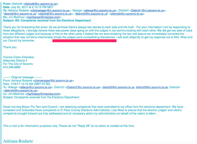 City Representative Yvonne Colon-Villalobos was the subject of two complaint letters sent to the City of Socorro due to alleged behavior and legal infractions during the early voting period of the last round of elections in Socorro. In an email I obtained, Rep Colon-Villalobos blames the Elections Department.