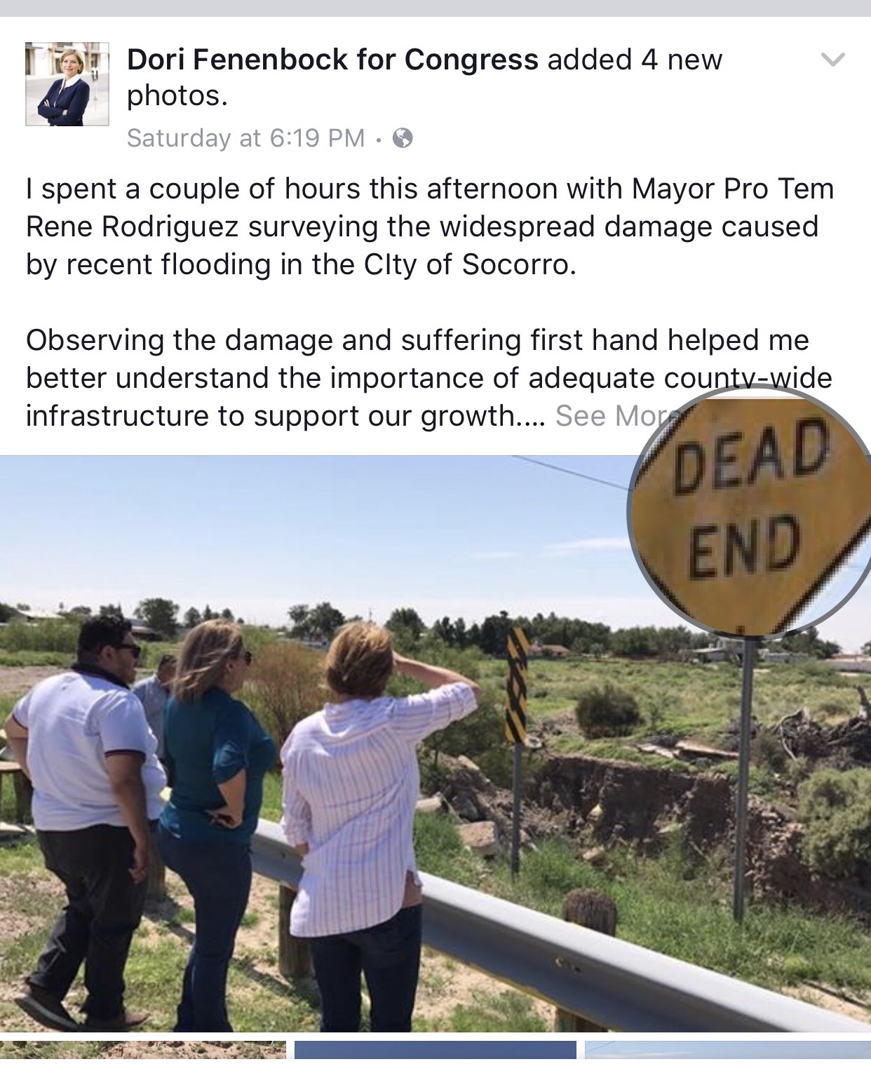 Going back to the Fenenbock Photo-Op, you'd think with all the money she has that she'd pay someone to mind her social media. Does she not know the subliminal message that is being sent when a candidate is sponsoring a social media ad to pain them in a good light that actually features a sign that says "Dead End"?