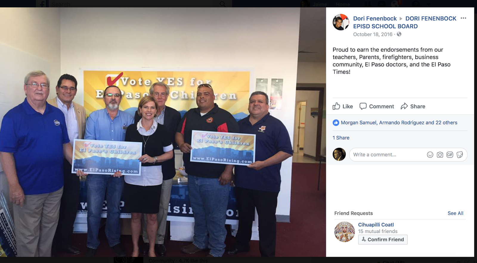 I have been in consultation last night and today with my state and national AFT leadership as well as AFL-CIO leadership on this matter. As I advised both Ms. Fenenbock and Ms. Escobar Wednesday, the EP AFT/TX AFT/AFT endorsement process has not begun, let alone a decision made. Ms. Dominguez’s remarks in that meeting were inappropriate and inaccurate, and may have created a false impression that EP AFT/TX AFT/AFT has endorsed her. Whether her remarks were intentionally or inadvertently disingenuous is unimportant, they were made.