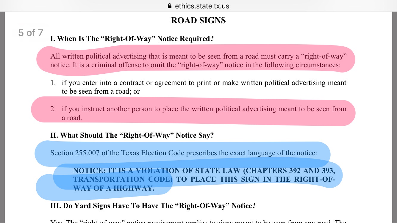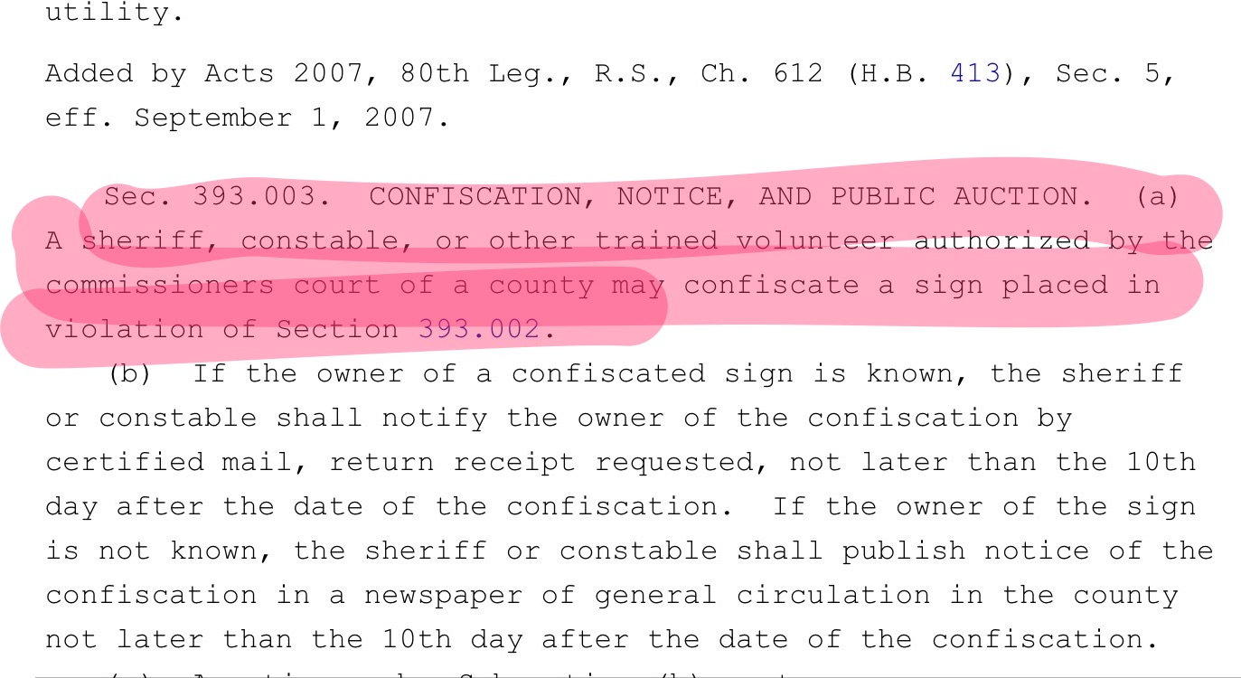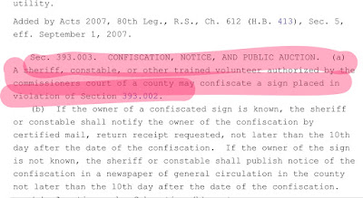And according to the code, a deputy or a constable can actually CONFISCATE a sign that is in violation of the statute, as noted here: