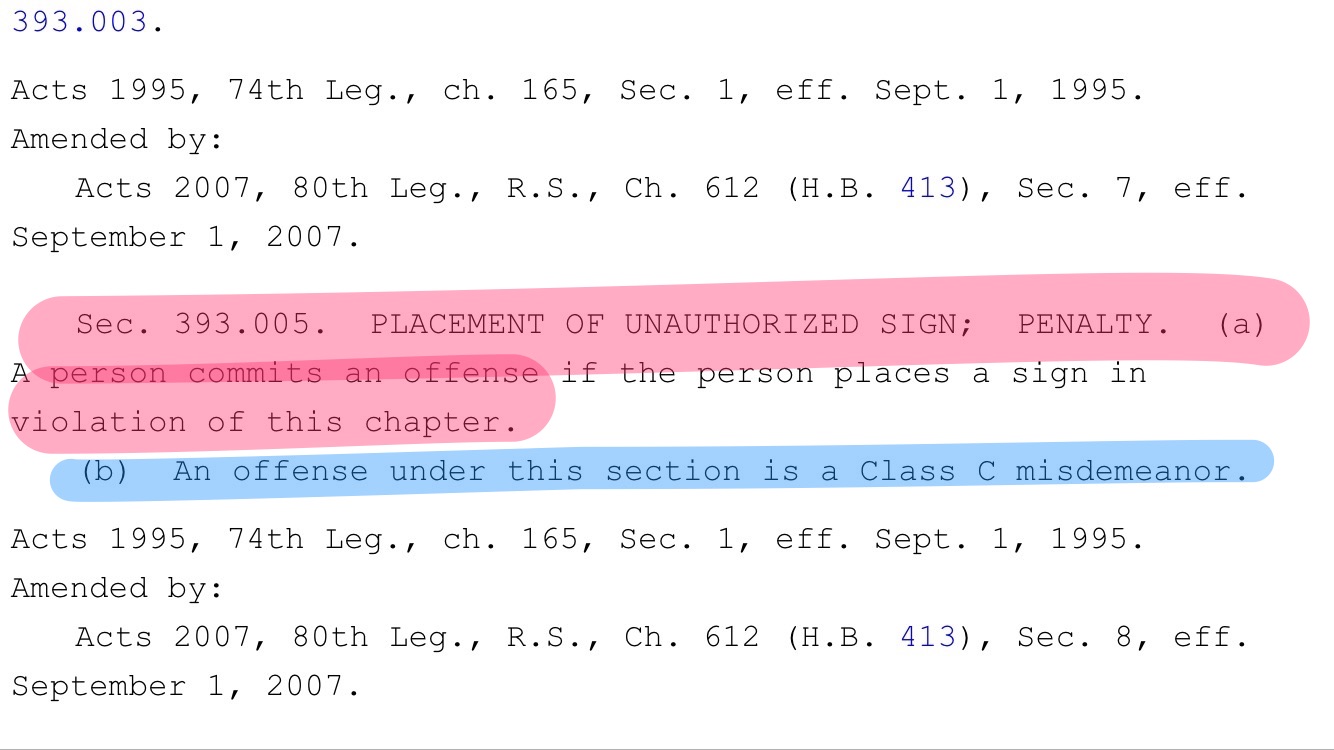 Now lets talk about placement of the sign. As you can see from the picture above, the sign is actually ON North Loop. It is required to not even be in the right-of-way of a road. Here is where the code says that doing so is a criminal offense: