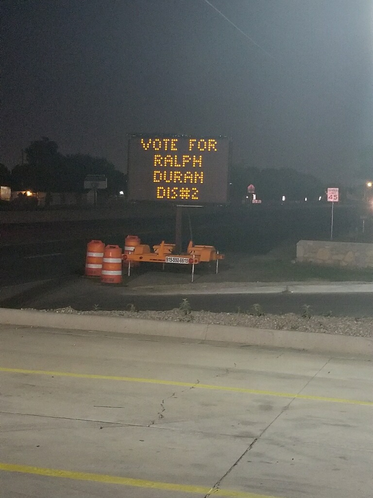 At issue is a traffic control device usually used to advise motorists of some change in driving conditions due to an emergency, safety hazard, or other construction-related issue. Duran, along with Apache Barricade Company, have been putting a message that has nothing to do with traffic control on the signs that says "Re-Elect Ralph Duran for District 2 Representative".