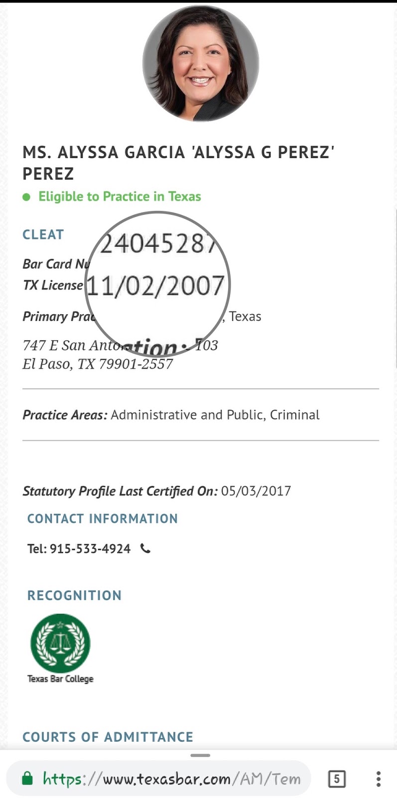 So according to the State of Texas, she has 10 years of experience as a lawyer. I struggled to figure out how she came to 15 when she only has 10. Honestly, I can't figure it out.