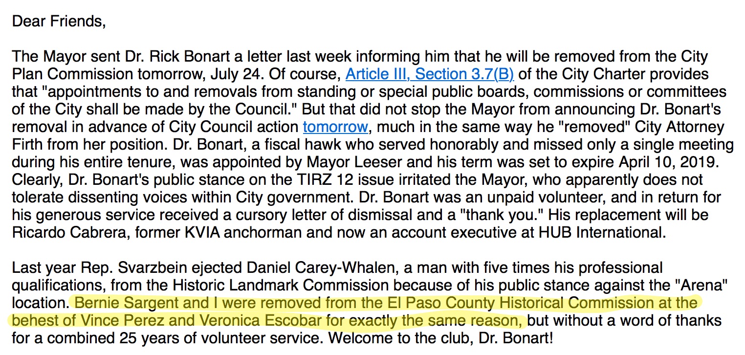 Okay, fun time is over. This email is actually something that is quite serious. I've long held the believe that Grossman is yet another in a line of bad actors on El Paso's political scene that is going to use money and influence for his own personal benefit. at the end of the aforementioned email, which I highlighted in yellow, he makes an absurd claim. He alleges he was removed from the El Paso County Historical Commission because of his opposition to the arena.