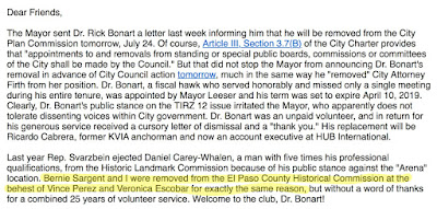 The nonsensical Trumplike tirade is all over the place, drawing a nonsensical comparison between the removal of Sylvia Firth and the removal of Bonart from a commission. Anyone who knows city hall knows that Cassandra Brown really pushed the ouster of Firth more than anyone else. Don't get me wrong, I love when Grossman goes after the mayor, I'm a Democrat so I love me some Republican on Republican crime. Its like watching Saucedo go after Margo all over again, no matter who loses, I win.