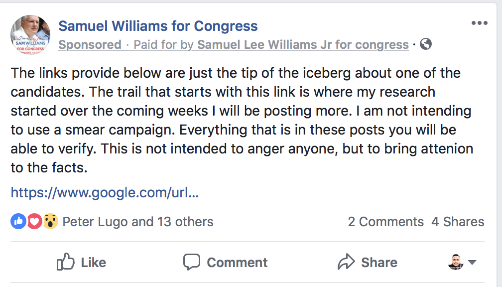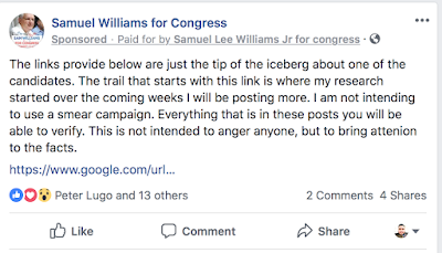 Let me back up a bit and explain what is going on. Samuel Williams is an ultra-conservative Donald Trump fan. He's running as an "independent" but he's not independent at all. He's a Republican. He just didn't get his Party's nomination.