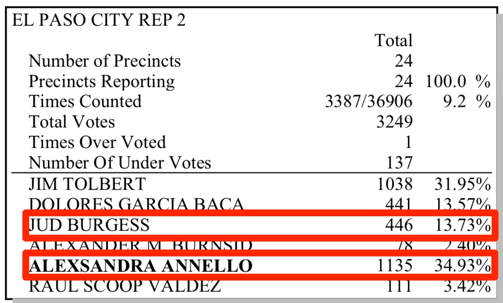 Burgess took on an incumbent in a recent election as well. He took on a political wounded incumbent in Jim Tolbert. And as you can see by the results, he was trounced. Tolbert got more than double the voters Burgess did and was well out of contention for even a run-off appearance. In fact, Burgees was taken out to the woodshed and was trounced by Annello by more than 20 points.