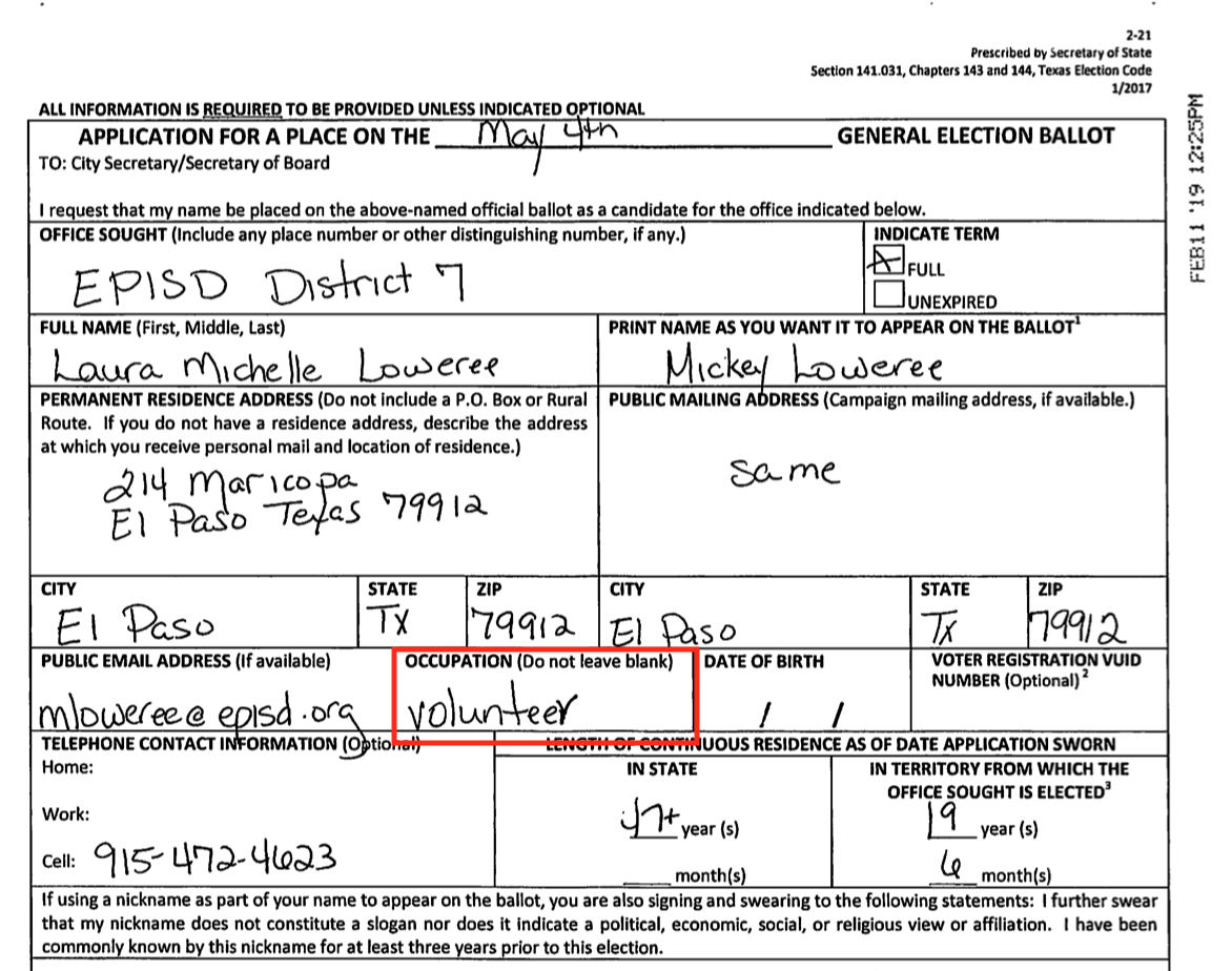 I was sent a picture of Loweree's lit that was left at homes following her block walk last week and she makes an interesting claim on the lit. She refers to herself as a "volunteer teacher" with EPISD. Well I called EPISD and spoke to their HR department and there is no such position as a volunteer teacher.