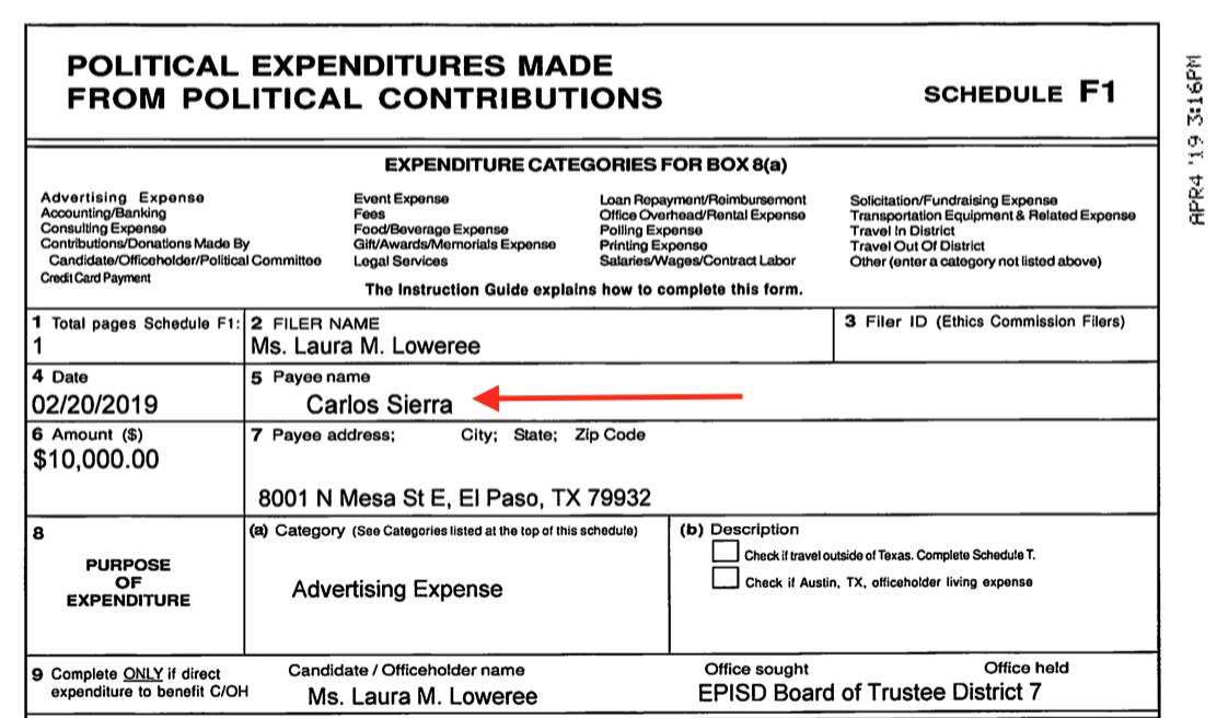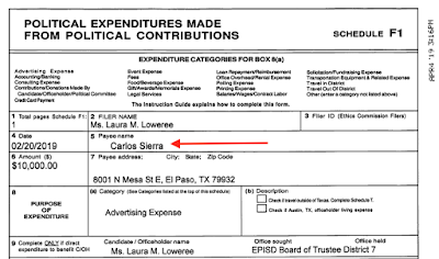 What is interesting is that she lent herself the money and then in the same day gave 100% of the money to the infamous Carlos Sierra - who is the guy behind the shady PAC that went after Escobar in the last election cycle and failed to comply with federal campaign finance regulations.