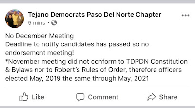 He posted an update to the Tejano Facebook page stating that the endorsement meeting was no longer going to happen and then alleged that the last meeting didn't follow Robert's Rules of Order or the State Tejano's Constitution.