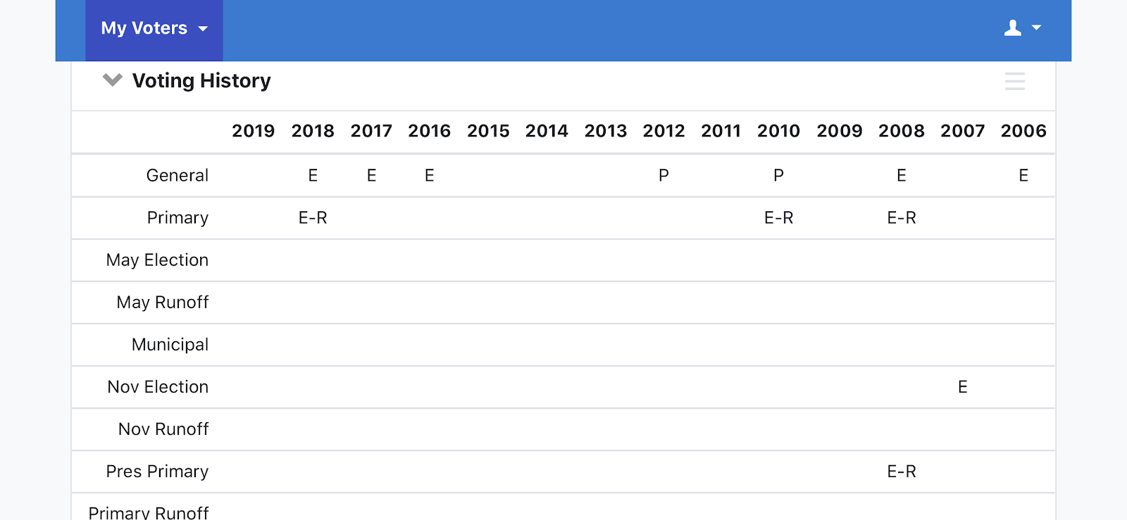 The woman off to the right is Representative-elect Claudia Rodriguez who ironically was elected largely on the name ID of Tamayo's opponent, current District 6 city representative Claudia Ordaz Perez. I pulled up her voting history. She's only voted in Republican primaries. Don't believe me? Well I'll be happy to show you. Here's a screenshot of her voting history from VAN.